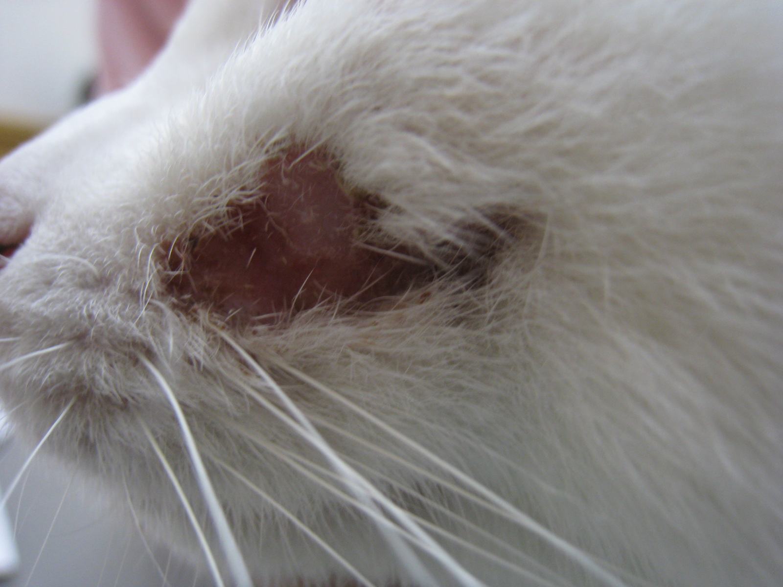 猫ちゃんでは、頭や顔、首などに掻き傷や粟粒性皮膚炎といって栗の粒のような皮膚炎が見られます。