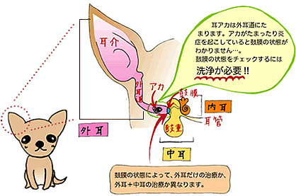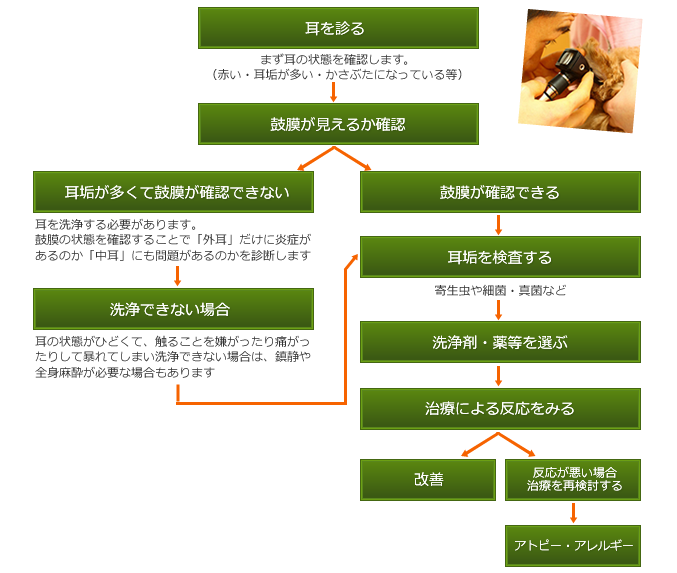 炎症がひどく痛みがある場合は、無理に治療しないで消炎剤を使い、ある程度よくなってから耳の治療を行うか、沈静下で耳の処置を行う必要があります。